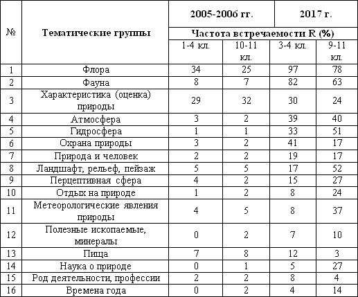 1. Тематические группы «Флора», «Фауна», «Характеристика (оценка) природы» являются более разнообразными и объёмными по числу R у младших школьников, затем «Охрана природы», «Атмосфера», «Гидросфера». Группы «Наука о природе», «Полезные ископаемые» являются малочисленными, что представляется вполне закономерным: в силу возраста ии. и ограниченности их знаний, поскольку у младших ии. только начинают формироваться научные знания об окружающем мире. К старшему школьному возрасту увеличивается разнообразие и наполняемость R в этих группах.
