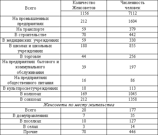 Кроме того, имелись Женсоветы, созданные по территориально-производственному признаку (когда в состав Совета входили женщины, работавшие в расположенных на данной территории предприятиях, организациях, учреждениях) [2, л. 14].