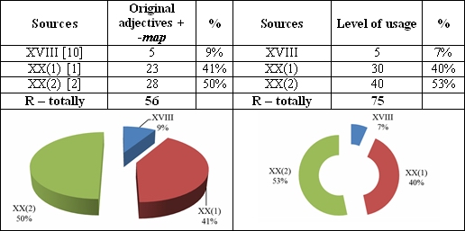 Thus, in the language of the compared historical productions belonging to the relevant periods, the suffix -тар is used to express the comparative degree of adverb and approximate numerals as 161 instances from it in [10] 45 instances (28%), in [1] 89 instances (55%) and in [2] 27 instances (17%) which contains 68% totally. However, the mentioned suffix is used only 75 instances in order to express the comparative degree of adjective include (32%).