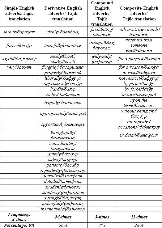 Designing on the premise of the above-adduced examples one can assert that English equivalents of Tajik derivative adverbs formed by dint of this prefix are not identical and the same-formed ones, namely most of them are resorted and translated, hereby we are going to reveal their generalities and differences based on the below table: