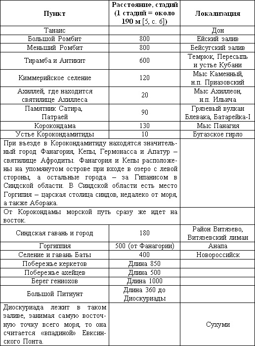 Попытаемся пройти маршрутом Страбона (см. таблицу 1). Первым пунктом стал Танаис – Дон, после которого заметным ориентиром на расстоянии примерно 150 км, или 800 стадиев, как указано в тексте античного географа, мог стать Ейский залив [14, с. 327]. Примерно такое же расстояние путешественники пройдут морем до Бейсугского залива и Ахтырского залива [14, с. 327]. Через 120 км (600 стадиев) корабли окажутся в районе побережья Темрюк – Пересыпь, где отмечаем азовское устье Кубани [14, с. 311]. Следующим ориентиром мог стать мыс Каменный (около 30 км от Пересыпи, или 120 стадиев – у Страбона), в окрестностях которого и располагалось Киммерийское селение (район н. п. Приазовский). У Птолемея как раз мыс Киммерий и Ахиллей при устье Боспора имеют самые северные точки координат Таманского полуострова [14, с. 192].