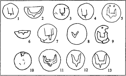 С.М. Михеев, в свою очередь, отмечает, «наблюдения над типологией знаков позволяют утверждать, что их начертание со временем видоизменялось: вместо древнейших двурогих тамг князьями стали использоваться сходные с ними колоколовидные, Џ образные, Ш образные знаки» [10, с. 45].