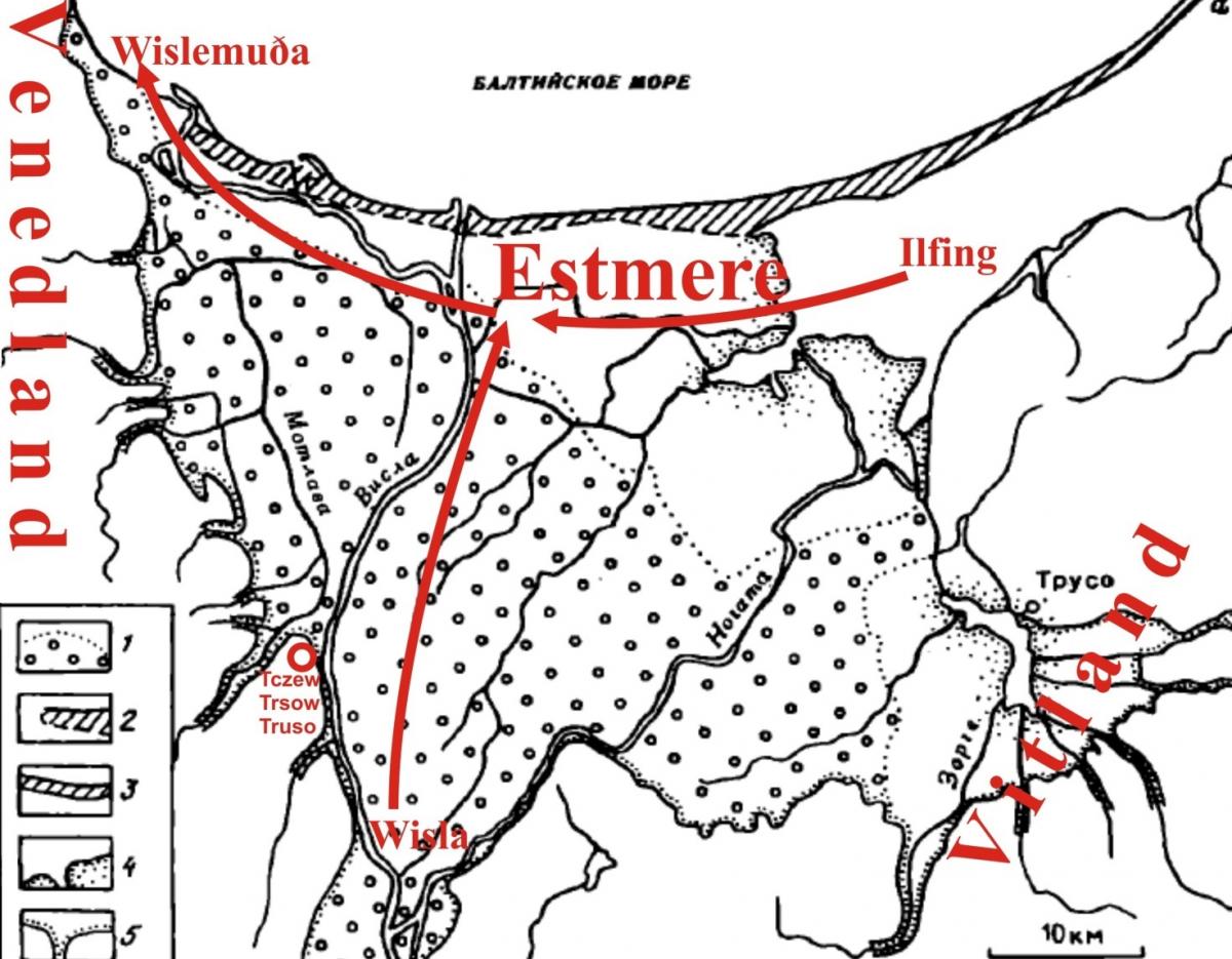 Другим свидетельством мореход отмечает, что Висла разделяет земли Веонодланда (к западу) и Витланда (к востоку), который принадлежит эстам [9, с. 26]. При этом Ифлинг вытекает не из Витланда, а к востоку из Эстланда, тогда как Висла течет с юга от Веонодланда, т.е. мы видим не параллельные потоки, а перпендикулярные. При этом, средневековой автор дает уточнение, что Илфинг приходит с востока в Эстмере – того озера, на берегу которого стоит Трусо. Аналогичный оборот, мы читаем и далее, что после слияния в Эстмере Ифлинг меняет название на Вислу и вместе они «текут от того озера».