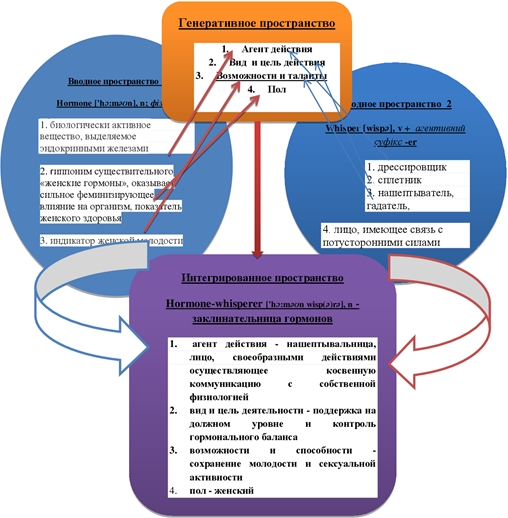 В результате интеграции двух вводных пространств возникает новое креативное понятие hormone-whisperer, что буквально может значить «Заклинательница гормонов». В когнитивном плане значение композита состоит из элементов двух вводных пространств, что схематически можно представить таким образом (рис. 1):