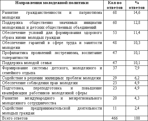 Респондентами были выделены направления молодежной политики, которые являются приоритетными для реализации управления духовно-нравственным и патриотическим воспитанием молодёжи на территории своего муниципального образования. Данные отражены в таблице 1.
