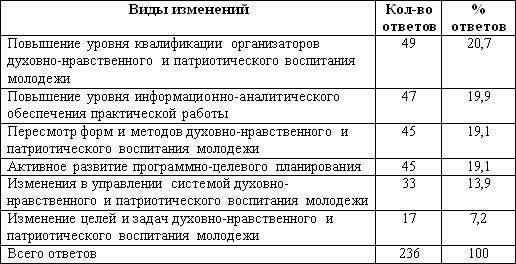 Существенной компонентой результата работы с респондентами стало выявление констатации ими как организаторов воспитания необходимости повышения их квалификации. Обозначая изменения, которые могут повысить уровень эффективности системы организации духовно-нравственного и патриотического воспитания молодёжи, участники исследования наибольшее количество – 20,7% ответов отдали повышению уровня квалификации организаторов духовно-нравственного и патриотического воспитания молодежи.