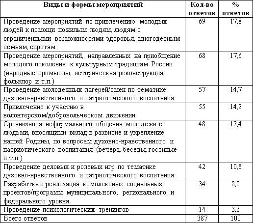 Возвращаясь к вопросу о добровольчестве, поднятому ранее в анализе данных таблицы 2, хотим обратить внимание на то, что, хотя, определяя понятие «патриотизм», «Участие в добровольческой/волонтёрской деятельности» выбрали только 11% опрошенных, в список мероприятий (форм организации молодёжи), которые необходимо проводить для улучшения духовно-нравственного и патриотического воспитания молодёжи, мы включили два, имеющих непосредственное отношение к добровольчеству. Их выбрали 32% опрошенных. Такое несоответствие количества выборов свидетельствует о недостаточной грамотности специалистов, работающих с молодёжью, в вопросах, касающихся сущности и содержания волонтёрской деятельности.
