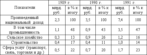 – ключевой отраслью экономики выступала промышленность, в то время как доля сферы услуг в структуре национального дохода составляла в 1991 г. всего 23%;