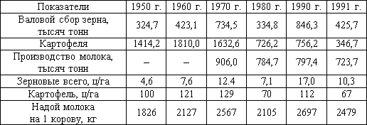 Сельское хозяйство Смоленской области отличалось ярко выраженной неустойчивостью развития. За сорок лет с 1950 по 1991 гг. сокращение производства сельскохозяйственной продукции по отношению к предыдущему году происходило 22 раза, в особенно нестабильном растениеводстве – 24. В отдельные годы, как валовой сбор зерна и картофеля снижался более чем в два раза (см. таблицу 3).