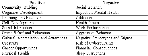 Table evidently shows that gaming could easily lead to symmetrical positive-negative consequences: community building – social isolation; cognitive development – impact on mental health; stress relief and relaxation – aggressive behaviour, etc.
