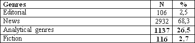 The definition of genres (or, more precisely, the criteria for singling them out) remains one of the main problems for journalistic theory. Soviet theory of journalism proposed to categorize journalistic materials into genres depending on how they answer three main questions: what is covered, for what purposes, and how. Continuing this tradition, A. Tertychny in his book “Genres of the periodical press” discovered the main genre-forming factors in journalism: 1) the subject of representation, 2) the intentions of the text, and 3) the methods of researching the subject. He identifies 35 journalistic genres [q.v.: 5].
