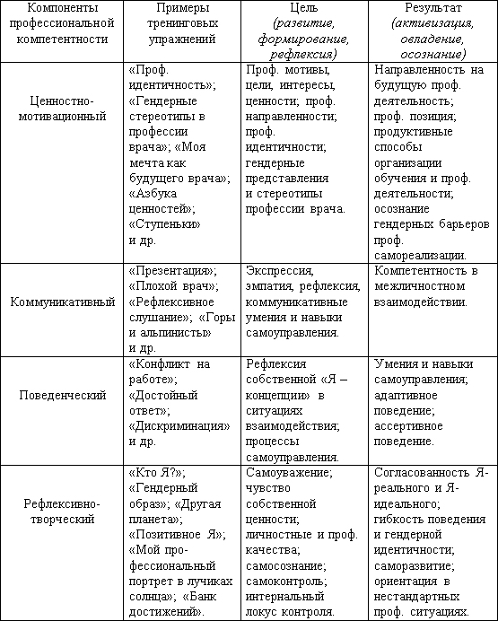 Тренинг рассматривался нами как эффективный метод интенсивного развития ценностно-мотивационного, коммуникативного, поведенческого и рефлексивного-творческого компонентов профессиональной компетентности будущих врачей, а также как способ смягчения психологической зависимости студентов-медиков от гендерных стереотипов, существующих на пути профессионального развития мужчин и женщин [3; 6; 7].