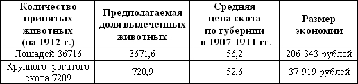Эти данные наглядно демонстрируют, что расширение амбулаторного лечения животных при росте вложений в ветеринарию не только окупались для земств, но и способствовали значительной экономии для крестьян-скотовладельцев. Тульская губернская земская управа вычислила ежегодную экономию для населения губернии, при своевременном лечении скота, в 136 800 руб., что также вдвое окупало расходы земств на ветслужбу [6, с. 8].