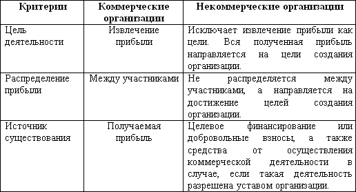 Организации можно разделить на коммерческие и некоммерческие (см. таблицу 1). Коммерческими считаются организации, основной целью деятельности которых является извлечение прибыли. Некоммерческими считаются те организации, которые не имеют извлечение прибыли в качестве основной цели своей деятельности и не распределяют полученную прибыль между участниками.