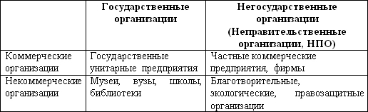 К государственным коммерческим организациям относятся государственные унитарные предприятия. Примерами государственных некоммерческих организаций являются образовательные (вузы), научные (институты РАН), медицинские (больницы, поликлиники), культурные учреждения (библиотеки, музеи). К негосударственным коммерческим организации относят частные коммерческие предприятия, фирмы. В качестве примеров негосударственных некоммерческих организаций можно привести благотворительные (Российский фонд помощи, Фонд «Подари жизнь»), экологические (Российское экологическое движение «Зеленые», Неправительственный экологический фонд имени В.И. Вернадского), правозащитные организации (Московская Хельсинкская группа, Межрегиональная правозащитная Ассоциация АГОРА).