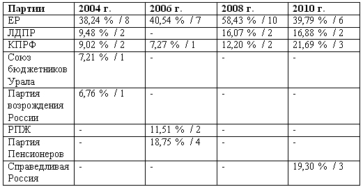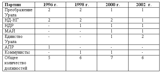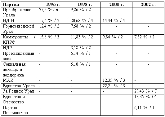 Как видно из таблицы, ни одна из партий не имела абсолютного большинства мест в Областной думе и, следовательно, не получила «контрольного пакета» нижней палаты Законодательного собрания Свердловской области (см. таблицу 2).