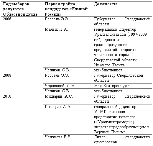 Успех «Единой России» был обусловлен и тем, что во главе списков кандидатов «Единой России» на региональных выборах стояли действующие губернаторы. Так, в 2004, 2006 и 2008 гг. это был Эдуард Россель, на выборах депутатов Областной думы в 2010 г. партийный список «партии власти» возглавлял Александр Мишарин. В такой ситуации выборы в Областную думу отчасти приобретали характер референдума о доверии губернатору.