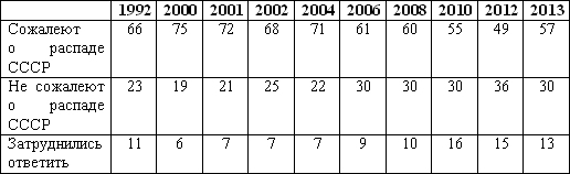 Как видно из таблицы, распределение ответов свидетельствует о том, что среди россиян доминирует негативное отношение к подписанию Беловежских соглашений и распаду Союза ССР. Необходимо отметить, что сегодня наблюдается уменьшение той доли респондентов, которые жалеют об исчезнувшей сверхдержаве, причем тенденция к снижению вполне устойчива. Тем не менее, цифры говорят о существовании в российском обществе «постимперского синдрома».