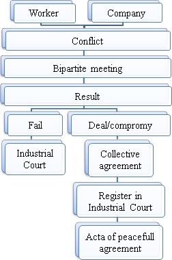 b. Step two, if bipartite meeting fail or cannot get deal anymore, the parties report this dispute to man power department. Meanwhile, if bipartite meeting success, the result of bipartite meeting written as collective agreement and will register at Industrial Court.