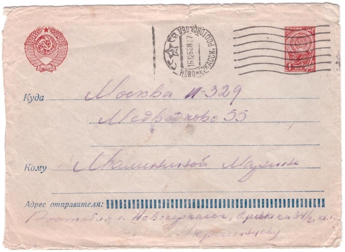 Согласно штемпелям на конверте, письмо отправлено (и получено) в декабре 1962 г. На конверте указан обратный адрес Виктора Николаевича в Новочеркасске. Адресовано письмо Марине Малининой.