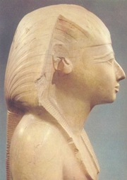 У одной из статуй царицы, выполненной из красного гранита, формы тела женские, но на голове есть символы царей-мужчин: немес и урей [VII]. Отец Хатшепсут умер, когда царевна была совсем юной [4, с. 14], поэтому она рано наследовала престол [5, с. 95]. Хатшепсут получила благословение жрецов бога Амона на правление. Также ей помогали управлять страной советники Тутмоса I. Она стала регентом при малолетнем сыне фараона Тутмосе III. Изображения царицы с женскими чертами характерны именно для раннего периода правления женщины-фараона (примерно до 1492 г. до н.э.).