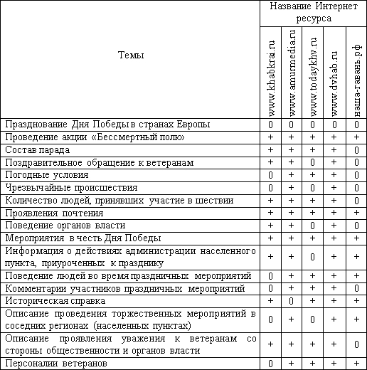 Для наглядного отображения информации все полученные данные были занесены в таблицу, где знаком «0» обозначаются темы, не поднимаемые на данном ресурсе, а знаком «+» – поднимаемые.