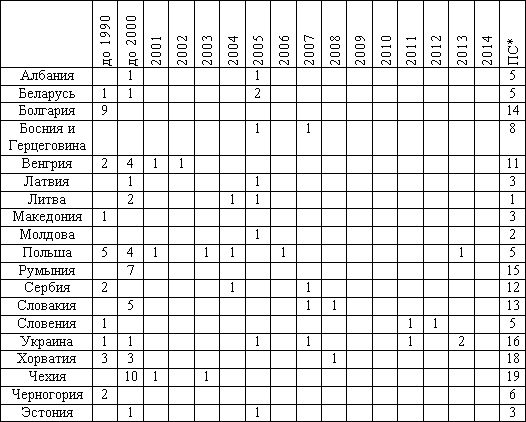 Для анализа активности политики стран ЦВЕ во включении своих памятников в Список объектов Всемирного наследия ЮНЕСКО нами были исследованы динамику включения объектов каждой страны и количество объектов в т.н. «Предварительном списке», который обязательно формируется странами из объектов, которые она хочет включить в Список ЮНЕСКО. Результаты представлены в таблице 3.