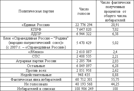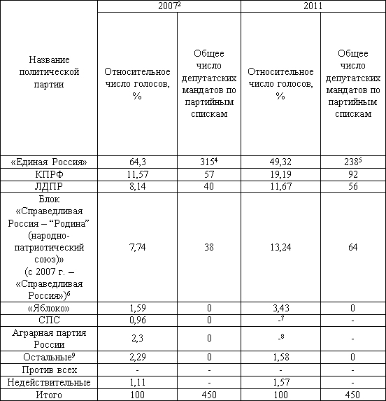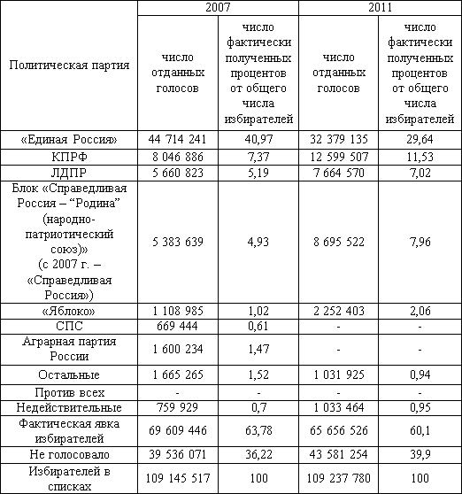 Успех «партии власти» в 2007 г. объясняется новым законодательством, которое сама же «Единая Россия», пользуясь коалиционным конституционным большинством, и смогла утвердить в период с 2003 по 2007 гг.: повышение барьера прохождения в парламент с 5 до 7%, ликвидация нижнего порога явки и графы «против всех», отмена голосования по одномандатным округам, ужесточение требований в области регистрации политических партий при их оформлении и участии в выборах. Новое нормативно-правовое сито «отсеяло» мелкие партии, чьи голоса с предыдущих выборов вместе с процентами графы «против всех» в большей степени отошли «Единой России». Три партии так называемой парламентской «системной оппозиции» также улучшили свои результаты в абсолютном отношении, уступив в относительном: их отрыв друг от друга был незначителен, что не помешало руководителям партий заявить о своих достижениях и успехах. Кроме этого, провести в Думу 70% своих представителей «Единой России» помог довольно высокий рейтинг ее руководителя и предводителя федерального списка партии, президента В.В. Путина. Отрыв от ближайшего конкурента в лице КПРФ составил более 52%, или 258 мандатов в абсолютном выражении.