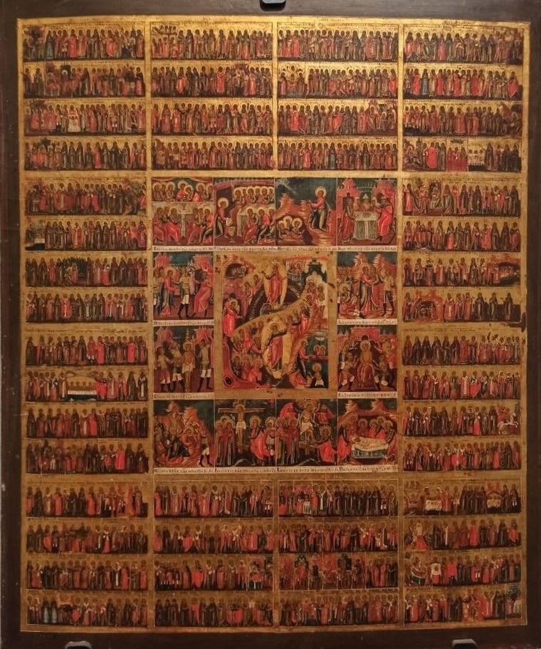 Отдельную и очень сложную тему представляют собой многофигурные иконописные месяцесловы (менологии, святцы). Традиция создания минейных икон, на которых в хронологическом порядке изображались все праздники и все святые, почитаемые в церковном (литургическом) году, имеет длинную традицию – первые такие иконы относятся к XII столетию и были найдены на Синае. На Руси минейные иконы получили широкую популярность только в середине XVI в., после появления Великих Четьих Миней митрополита Макария, содержащих, среди прочего, краткие и пространные жития святых [4]. Уже в конце XVI в. в русском искусстве сосуществовало два типа минейных икон – крупноформатные образы, включающие изображения сразу на два, три или четыре месяца, которые помещались в киот, или же комплекты 12 минейных икон небольшого размера на каждый месяц года, поочередно выкладывавшихся на церковный аналой [4]. В XIX в. в связи с развитием тенденции к миниатуризации, появились полугодовые или даже годовые иконы с сотнями небольших изображений святых. Данная тенденция хорошо просматривается на годовой минее из Государственного музея палехского искусства [VII].