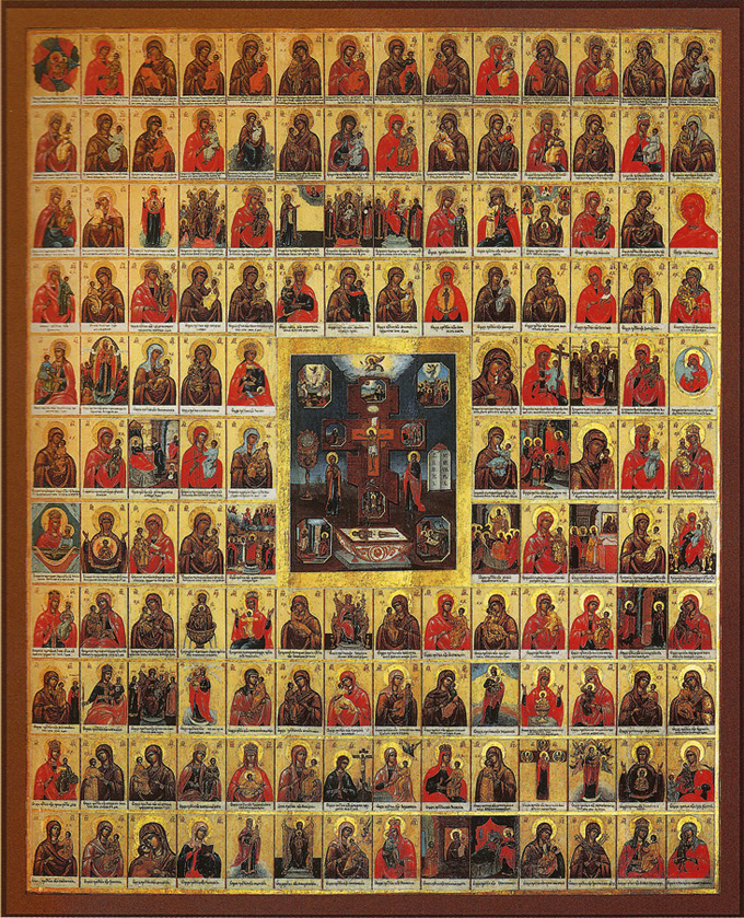 Изучением данного типа икон занимался И.А. Кочетков. Иконы с изображением свода многочисленных икон Богоматери были чем-то вроде путеводителя по богородичной иконографии [5, c. 404], хотя, как подчеркивал Кочетков, и являлись весьма ненадежным источником, так как зачастую неверно передавали наименование иконы, год ее явления и день празднования.