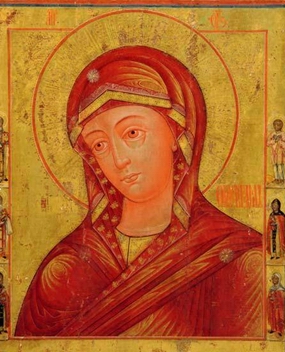 Богоматерь «Огневидная» – оплечный образ Божьей Матери, на котором та изображается глядящей направо, с легким поворотом головы и корпуса в эту же сторону [4, c. 138]. Можно предполагать, что Богородица молится, хотя не видно рук, которые долнжы быть направлены вверх в жесте молитвы. Для этой иконы характерно сильное преобладание совсем нетрадиционного для богородичных изображений ярко-красного цвета. Одежда Богоматери – омофор и плащ – также яркого пурпурного оттенка, а Ее лицо как будто светится огнем, легко просвечивающим через кожу. Как справедливо утверждает Т.Е. Гребенюк, вся иконография Богоматери «Огневидная» являет образ некоего молитвенного предстояния Богу [4, c. 160]. В этом контексте ярко-красный цвет огня символизирует любовь Пресвятой Девы к Богу и живую, пламенную веру.