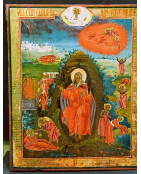 Огонь пожара изображался также на иконах «Огненного восхождения пророка Ильи», однако там они обозначал не смерть, а стремление вверх, на небеса. Данный ветхозаветный сюжет появляется не только у старообрядцев, но именно среди них пользовался особой популярностью. В центре на фоне красного круга огня пророк Илия в контурно изображенной колеснице, запряженной четырьмя конями, возносится на небо. Хотя сам Илия изображается «обычно», а кони и колесница, на которой едет пророк, написаны огненно-красными, просвеченными языками пламени.