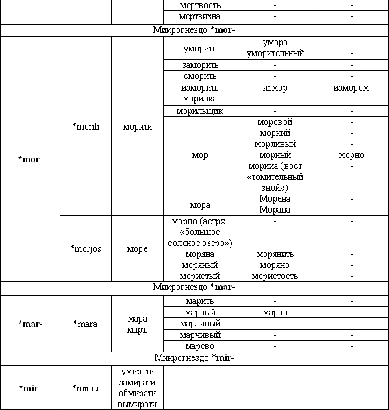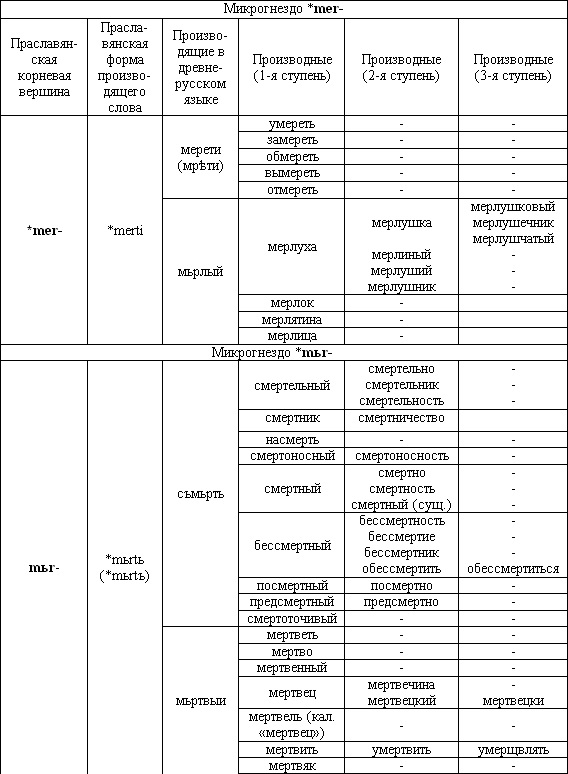 В этимологическом гнезде с инвариантной корневой индоевропейской вершиной *mxr- сохранились не все лексемы, так, русским языком утрачен неполногласный глагол мрети, отглагольное прилагательное мерлый (генетически являющееся «элевым» причастием), утрачены и почти все производные от него. Во всех славянских языках не сохранился глагол *mirati, давший много производных. Некоторые лексемы гнезда ушли в пассивный словарный запас, но остались производные от них. Из пяти вершин в русском языке ни одна не была утрачена, но их продуктивность в подгнездах различается. Самые непродуктивные – вершины *mеr-, *mar-, *mir, наиболее продуктивными оказались вершины *mьr-, *mor. От них в русском языке образовано наибольшее количество производных.