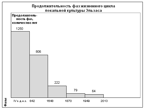 Исследование истории и социоцикличной динамики цивилизаций заставило нас сделать вывод о закономерности сжатия исторического времени. Каждый очередной шаг в истории цивилизаций, в том числе и локальных, характеризуется более коротким жизненным циклом, ускорением темпа исторического прогресса, учащением пульса цикличной динамики общества. Если временное пространство первых мировых цивилизаций и поколения локальных цивилизаций составляло несколько тысячелетий, то последних — всего несколько столетий [3, с. 92]. Эта закономерность подтверждается также при исследовании динамики жизненного цикла локальной культуры Эльзаса. Сравним длительность фаз. Обратимся к таблице: